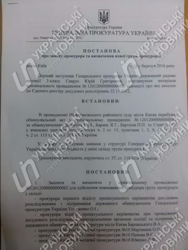 Первое заседание нового состава суда по длящемуся уже два с половиной года рассмотрению дела должно было состояться 17 марта 2016 года. Однако в тот же день и.о. генерального прокурора Юрий Севрук подписал постановление, копией которого располагают Українські новини