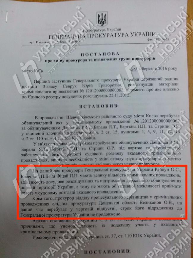 Согласно тексту этого Постановления, три прокурора Генпрокуратуры, которые длительное время занимались делом, сейчас «осуществляют досудебное расследование и поддержку гособвинения по всей территории Украины» по многим другим делам. А четвертый - находится в отпуске. А представителей местных прокуратур шлют чтобы «избежать срывов судебного заседания».