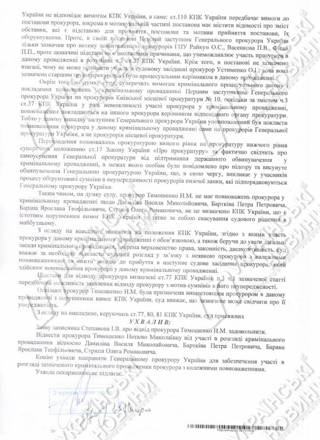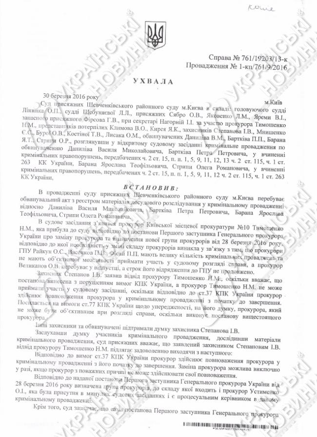 На следующее заседание 30 марта явилась только одна прокурор из числа сотрудников опять-таки Киевской местной прокуратуры № 10 Н.Тимошенко. Правда, уже с другим постановлением за подписью Севрука от 28 марта 2016 года. Этим постановлением назначалась очередная группа прокуроров из прокуратуры города Киева и местной прокуратуры.