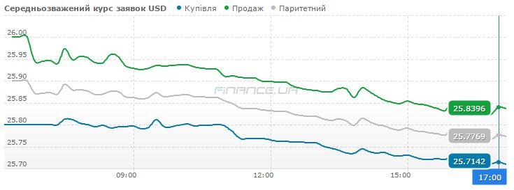 По состоянию на 17:00, согласно заявкам физических лиц, средневзвешенный курс покупки доллара составил 25,7142 гривни, продажи - 25,8396 гривни.
