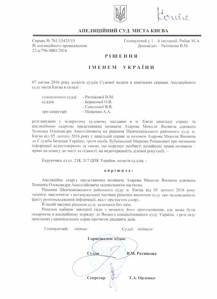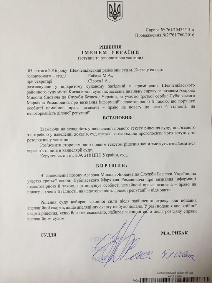 Азаров проиграл суд по делу о клевете (ДОКУМЕНТ)