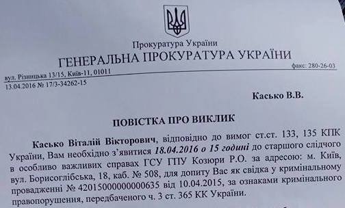 10 апреля около 10 вечера Виталию Касько сотрудники ГПУ вручили подозрение в совершении уголовных преступлений, предусмотренных ч.4 ст.190 (Мошенничество) и ч.4 ст.358 (Подделка документов) Уголовного кодекса Украины. Дело касается махинации с квартирами.