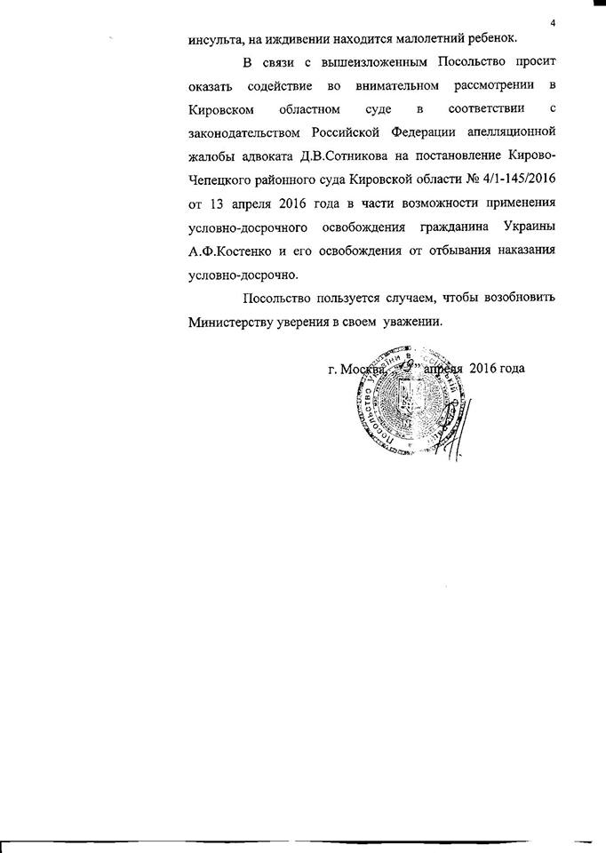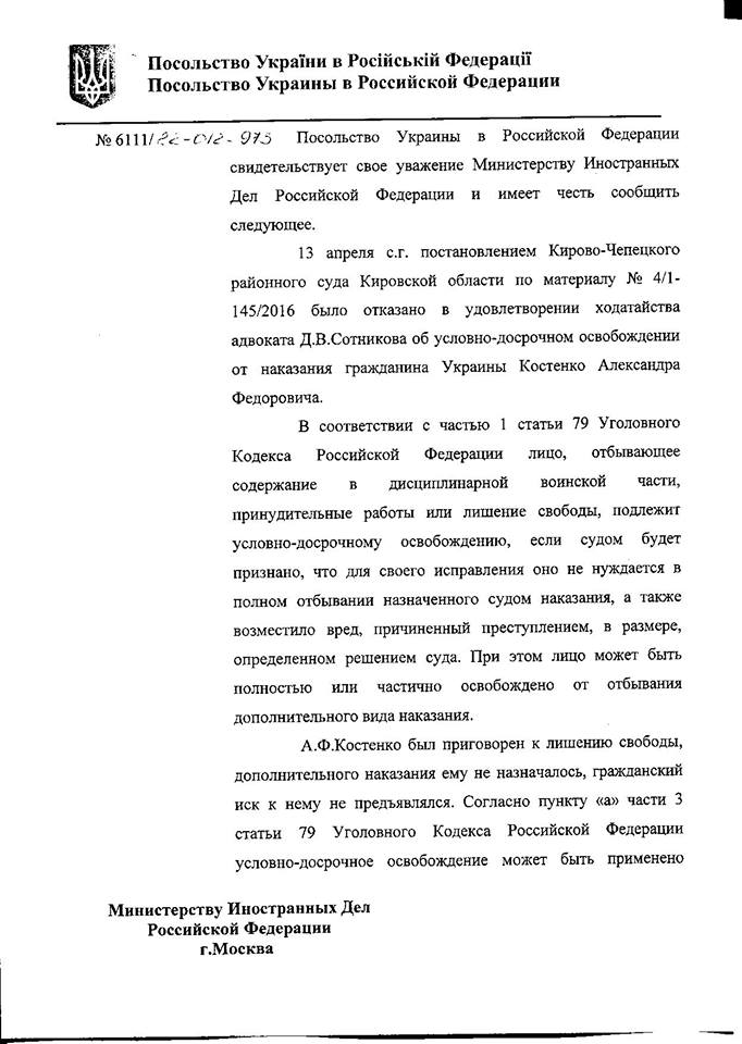 Посольство Украины в России подало ноту в МИД РФ по факту отказа в условно-досрочном освобождении Александра Костенко. Об этом в Фейсбуке сообщил адвокат Костенко Дмитрий Сотников.