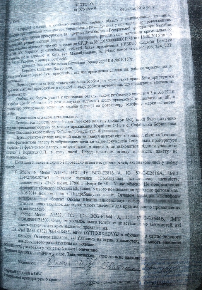 В пакете также лежал телефон iPhone 6, который, согласно документу, принадлежит жене прокурора Светлане Корниец. Согласно протоколу, в этом телефоне найдено смс-сообщение от 5 июля на адрес абонента, подписанного «Оксана Шокина» со словами «у нас обыск».
