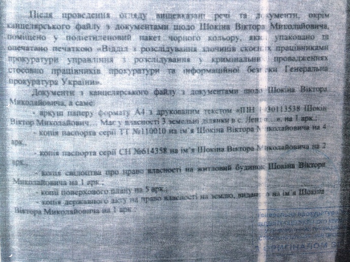 Среди изъятых документов был лист бумаги с печатным текстом, где указывается идентификационный номер Шокина, отмечается, что он не является предпринимателем и с 2001 года владеет как физическое лицо 3 земельными участками.
