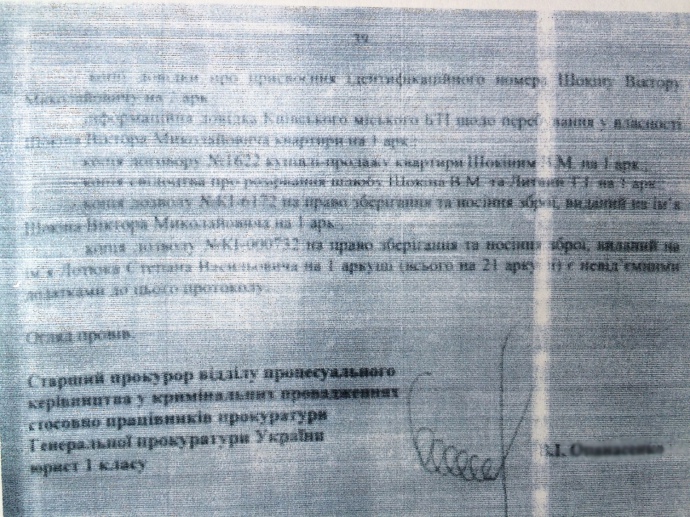 Также среди изъятых документов есть копия разрешения на ношение оружия, выданная на имя экс-прокурора Лотюка Степана Васильевича. Когда он был прокурором Киева, Шокин был следователем по особо важным делам.