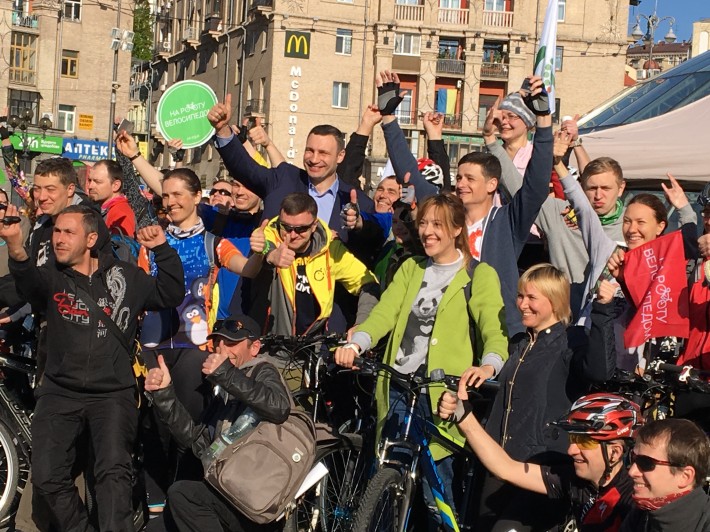 Мэр Киева Виталий Кличко традиционно принял участие в акции «На велосипеде на работу», которую устраивает велосообщество. Несколько лет подряд в день акции киевляне на велосипедах собираются на Майдане Незалежности, общаются, фотографируются и отправляются на работу.