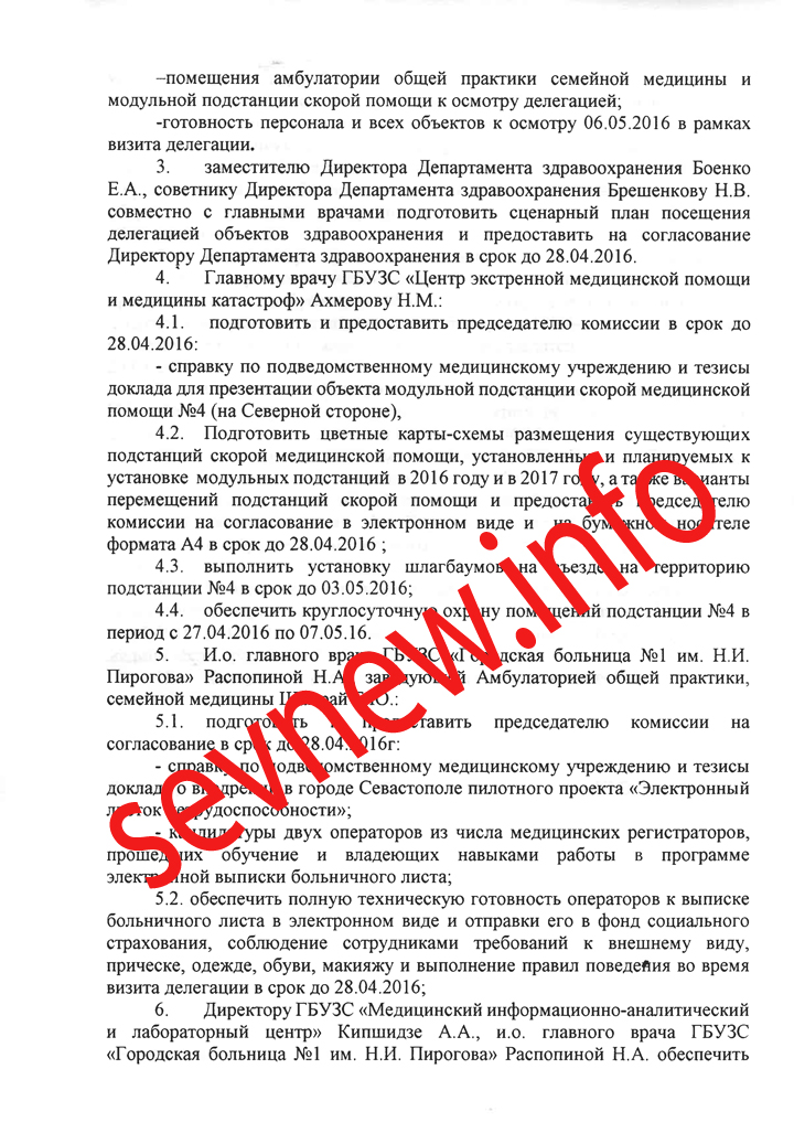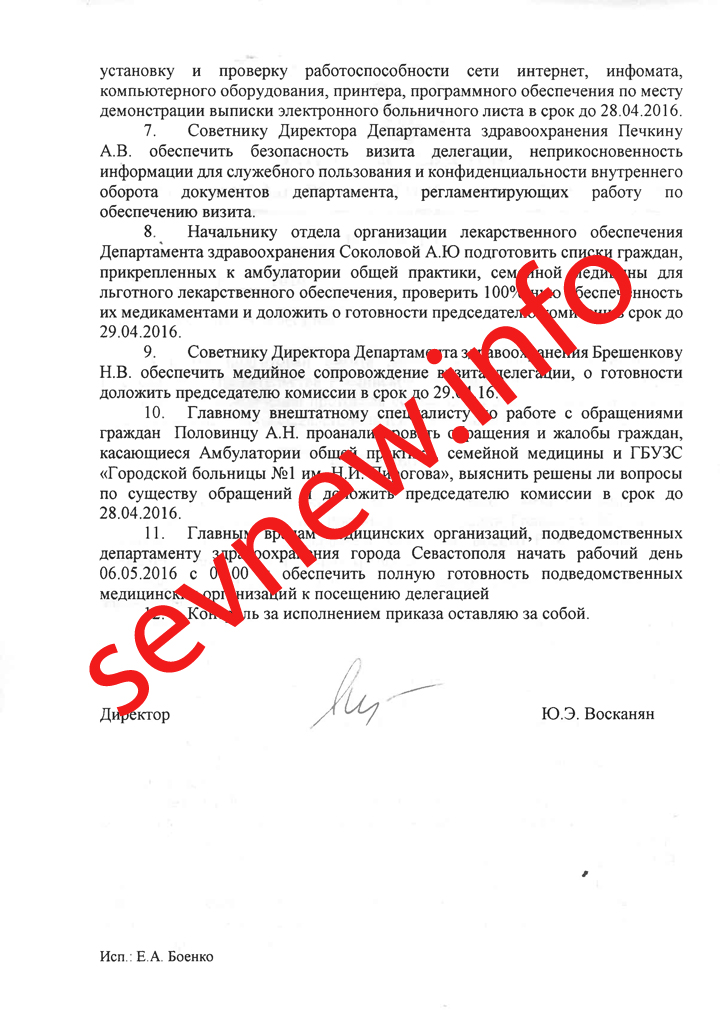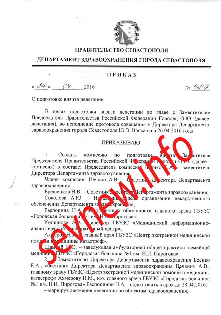 Соответствующий приказ директора «Департамента здравоохранения» оккупированного Севастополя Юрия Восканяна «О подготовке визита делегации во главе с заместителем Председателя Правительства РФ Голодец О. Ю.», опубликовали Новости Севастополя