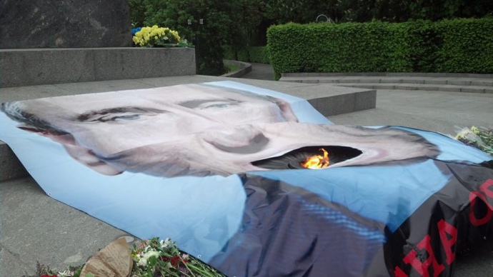 В парке Славы в Киеве Вечный огонь у Могилы Неизвестного солдата накрыли плакатом с изображением российского президента Владимира Путина.