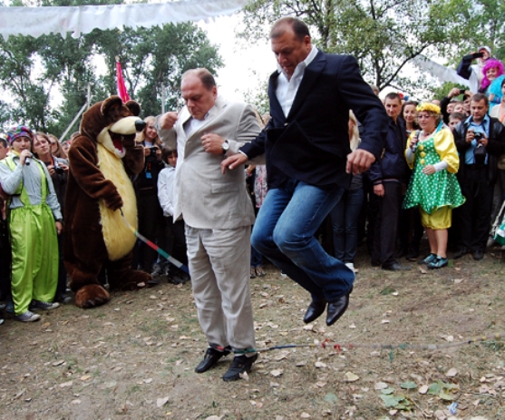 Так сначала Добкин и Кулиняк стреляли из лука и арбалета, а также вместе попрыгали через скакалку. А после этого со сцены запели песню.