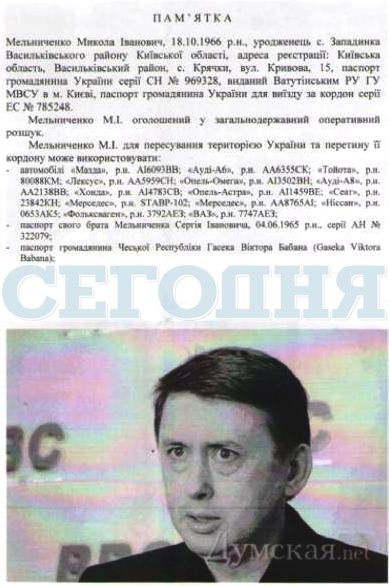 «Ориентировка на Мельниченко была прислана еще вчера вечером. В документе говорится о том, что Мельниченко находится в межгосударственном розыске, перечислен с добрый десяток автомобилей, на которых он может передвигаться, а также сказано, что он может пользоваться несколькими паспортами», - рассказала газете администратор гостиницы.