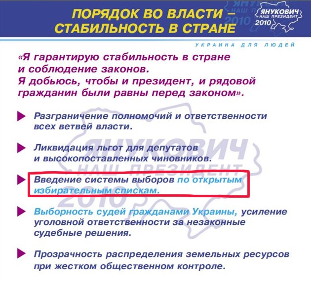 Венецианская комиссия считает, что в Украине должна быть пропорциональная избирательная система с открытыми региональными списками, о внедрении которой в своей программе «Украина для людей» обещал Виктор Янукович.