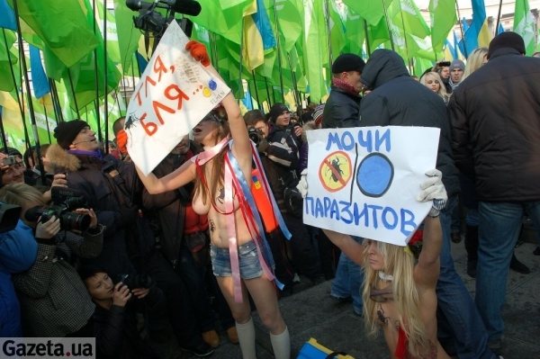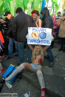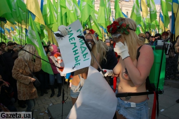 Активистки движения FEMEN провели акцию «Мочи паразитов!» во время которой подвергли митинг Яценюка «антибактериальной атаке».