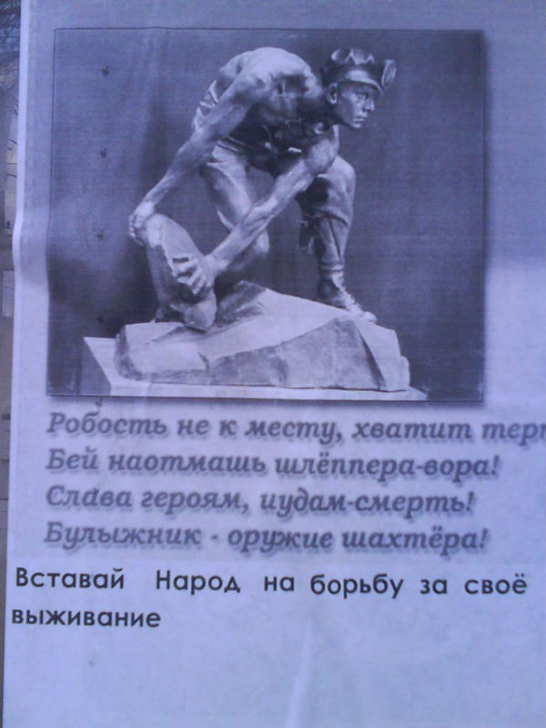 На листовках размещена фотография известной скульптуры Ивана Шадра «Булыжник - оружие пролетариата», под которой наводятся немного измененные строки из одноименной песни Александра Харчикова.