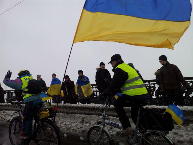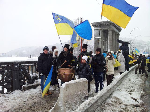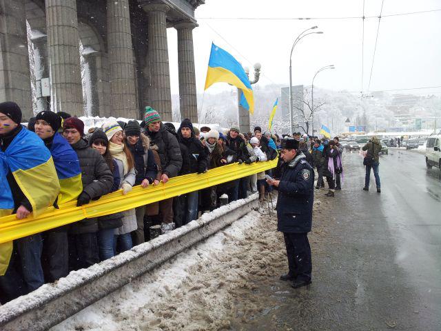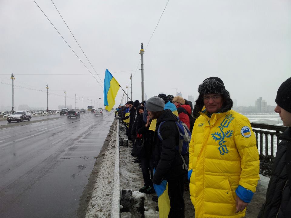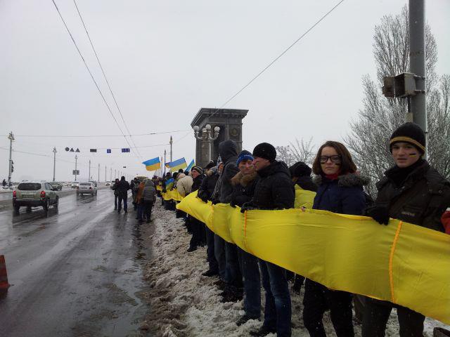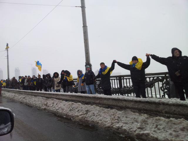 В день Соборности Украины на столичном мосту Патона, соединяющим два берега Киева состоялась акция «Соединим берега Днепра «живой цепью». Акция началась в 12:00, а в 12:30 состоялось объединение «живой цепи» в центре моста Патона.