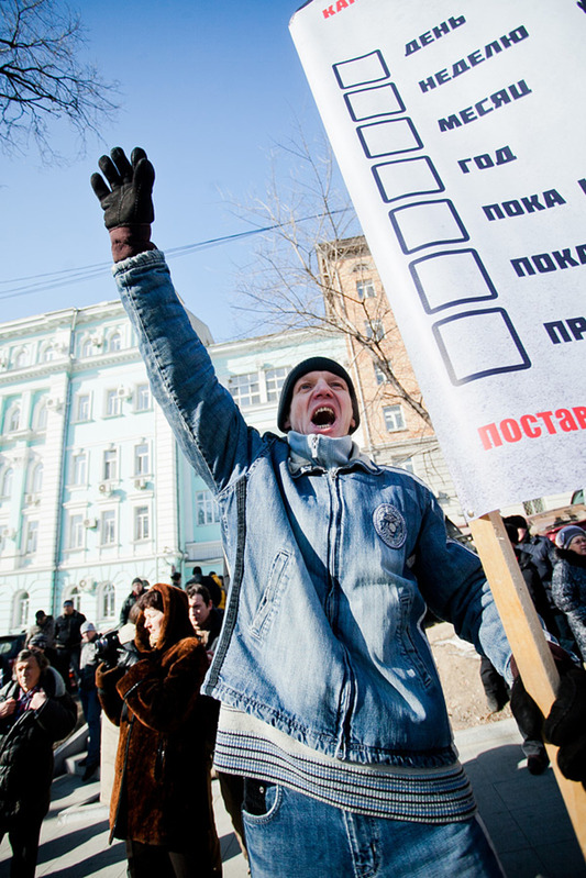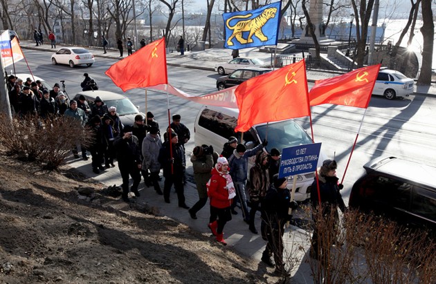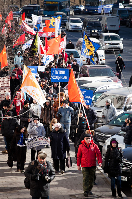 Во Владивостоке сторонники нескольких политических партий и общественных движений с флагами и транспарантами прошли по центральной улице. По данным полиции, в акции протеста приняли участие около ста человек, организаторы говорят о двухстах пятидесяти. Горожане пришли под флагами КПРФ, партий «Яблоко», «Свобода и народовластие», общественной организации «Товарищество инициативных граждан России» (ТИГР), сообщает «Радио Свобода».