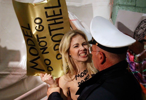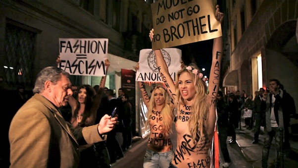 Как пишет Ридус, вечером 24 февраля традиционно обнаженные по пояс девушки с плакатами «Fashion = fascism» («Мода = фашизм») и «Модель, не иди в бордель» перекрыли вход в Дом Versace, где должен был состояться показ. Полиция и охрана в течение нескольких минут свернули пикет.