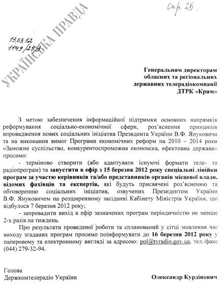 В нем глава Государственного комитета Александр Курдинович обращается к руководителям телерадиокомпаний «срочно создать (или адаптировать существующие форматы теле- и радиопрограмм) и запустить в эфир с 15 марта 2012 специальные линейки программ с участием представителей органов местной власти, известных специалистов и экспертов, которые будут посвящены разъяснению и обсуждению социальных инициатив президента В.Ф. Януковича».