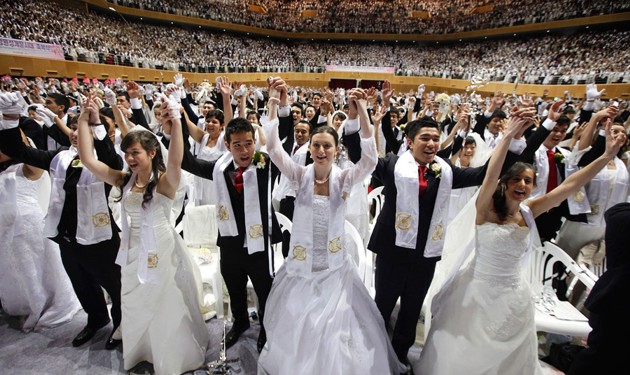 В Южной Корее прошла ежегодная церемония массового бракосочетания, организованная христианским течением «Церковь объединения». В эту субботу на спортивном стадионе в городе Капхен в 75 километрах от Сеула поженились 5 200 пар. С трибун за церемонией наблюдали около 20 000 зрителей.