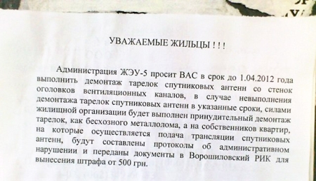 На добровольный демонтаж «тарелок» жильцам домов был отпущен срок до 1 апреля 2012 года. Спутниковые антенны, которые не будут сняты добровольно, ЖЭУ демонтирует «как бесхозный металлолом», а на их владельцев будут составлены акты об административном нарушении для вынесения штрафа 500 грн.