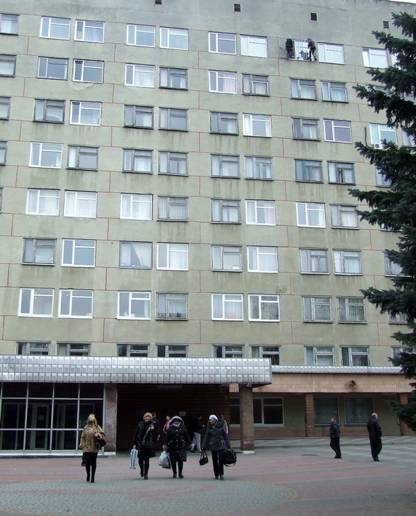 Отделение патологии позвоночника и периферической нервной системы расположено на 5-м этаже 9-этажного здания. Но на 9-м этаже здания сегодня рабочие устанавливали решетки, к вечеру – металлической сеткой закрыли пять окон.