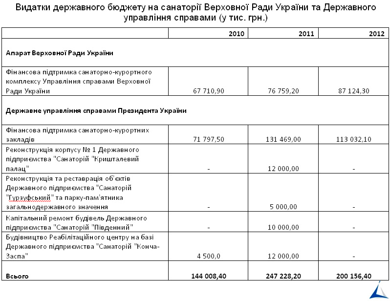 В 2010 году расходы на упомянутые санатории составили 144 млн. грн., в 2011 году - 247 млн. грн., а в 2012 году заложено более 200 млн. гривен.