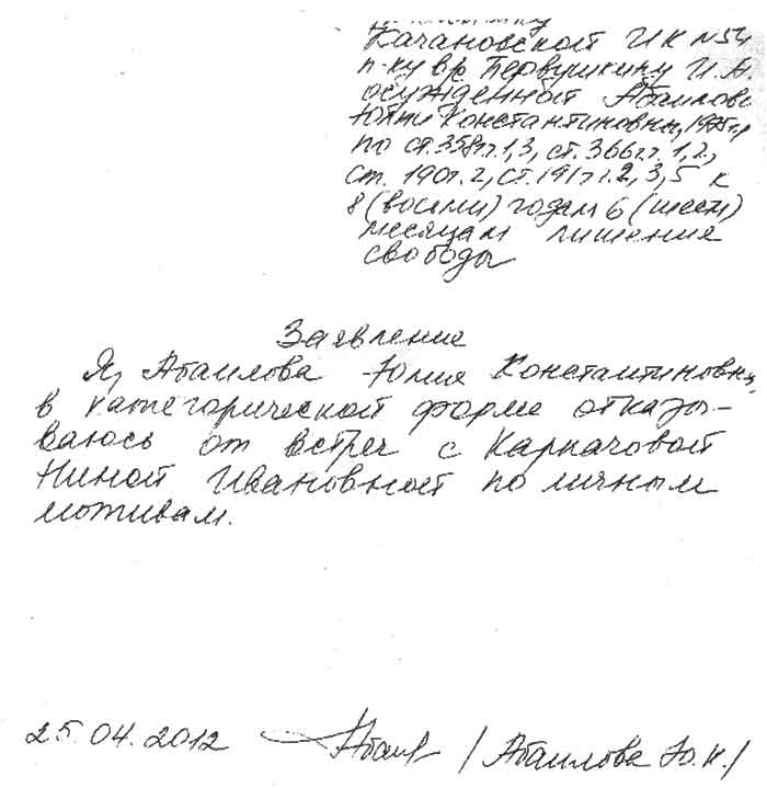 Встречаться с Карпачевой осужденная категорически отказалась, о чем подала руководству учреждения заявление, сообщили в пресс-службе ГПтС.