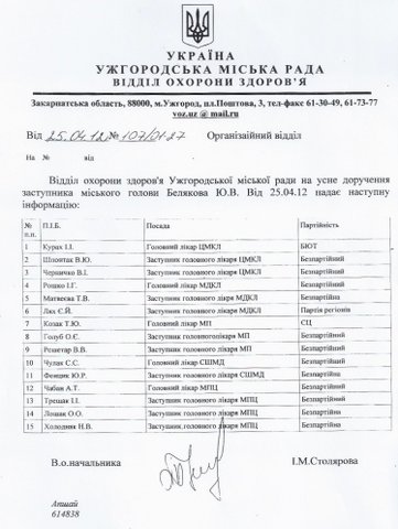В распоряжении «Мукачево.net». оказался документ, адресованный заместителю городского головы и председателю фракции ПР в Ужгородском горсовете Юрию Белякову и сформированный на основании его устного поручения проверить «политический цвет» работников бюджетной сферы.