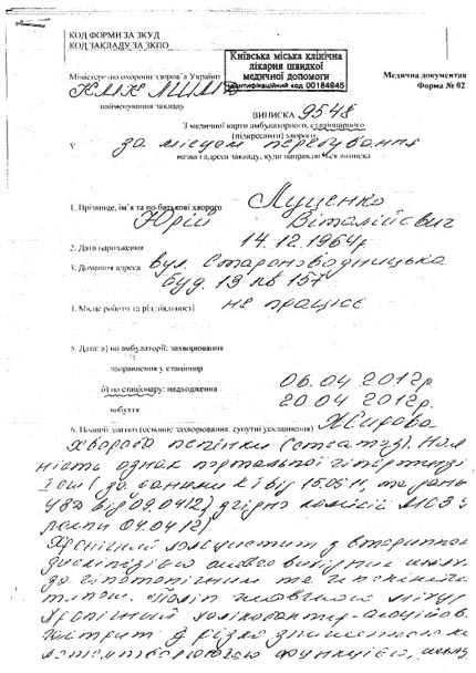 По словам Луценко, после голодовки он четыре месяца добивался обследования, а затем, уже с установленными болезнями, шесть месяцев требовал лечения. «Как оказалось, от меня полгода скрывали то, что в моей крови обнаружен вирусный гепатит TTV. Последние анализы это, к сожалению, подтвердили. После этого меня вывезли из больницы скорой помощи и никаких документов, а тем более медикаментов, не выдают... Боюсь, что в нашем с Тимошенко и Иващенко случаях речь идет не о здравоохранении, а о болезнехранении как форме мести», - уверен он.