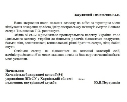 В ответ на письменное обращение Юлии Тимошенко с просьбой о кратковременном выезде за пределы учреждения и ЦКБ «Укрзализныци» ГПтС предоставила письменный отказ.