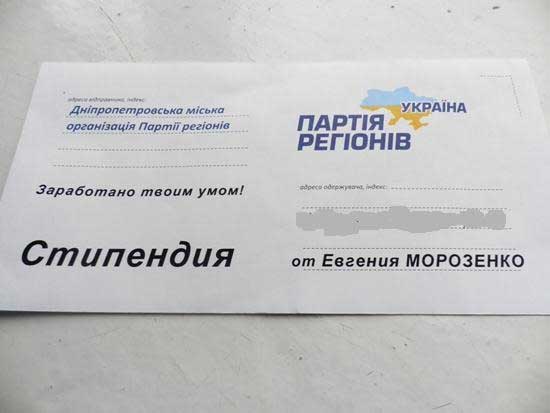 Как стало известно «Днепропетровск. Комментарии» от родителей учеников Ленинского района, на торжественной линейке, посвященной последнему звонку, в школах ученикам вручались именные конверты с надписью «Стипендия». На конвертах в качестве отправителя значилось: «Днепропетровская городская организация Партии регионов», от Евгения Морозенко. Размер стипендии составил 50 гривен.