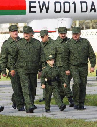 Присутствие Коли, сына президента Беларуси Александра Лукащенко, на всех официальных мероприятиях стало привычным. Оба Лукашенко были в камуфляжной форме и в погонах.