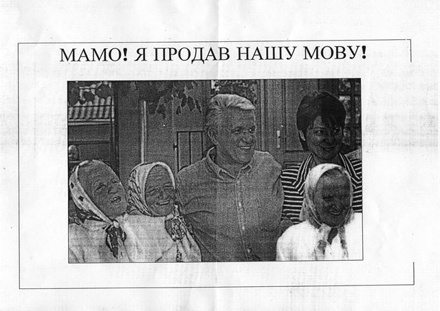 На листовках изображен Литвин среди бабушек, одна из которых, очевидно, является его родной матерью. Известночто она всю жизнь говорит только на украинском языке.