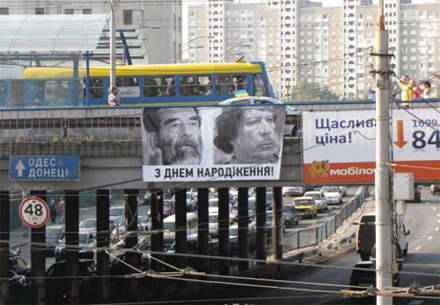 В нескольких местах в Киеве неизвестные вывесили поздравление Януковичу с изображением ливийского лидера Муаммара Каддафи, который был убит прошлой осенью. Об этом пишет журналист СТБ Наталья Соколенко.