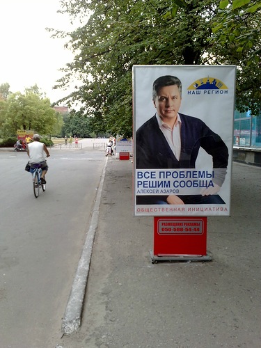 Рекламой кандидата в депутаты от партии власти, сына Николая Азарова Алексея утыкан весь Славянск. Об этом сообщает на ЖЖ пользователь frankensstein.