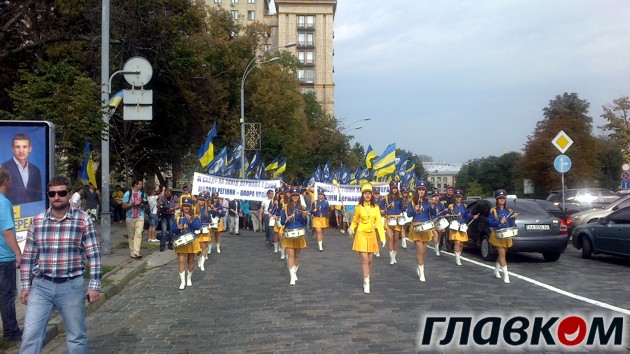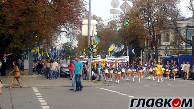 Милиция охраняла марш младорегионалов, перекрыв движение автомобилей. Митингующие с барабанами несли плакаты с надписями «Зі Сходу на Захід держава єдина, Молоді регіони – опора країни».
