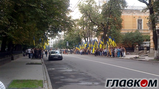 Около десяти часов утра колонна подошла к Администрации Президента, где их по обе стороны улицы Банковой уже ожидали около трехсот молодых людей с государственными флагами. Территория возле АП была зачищена для удобства марширующих.