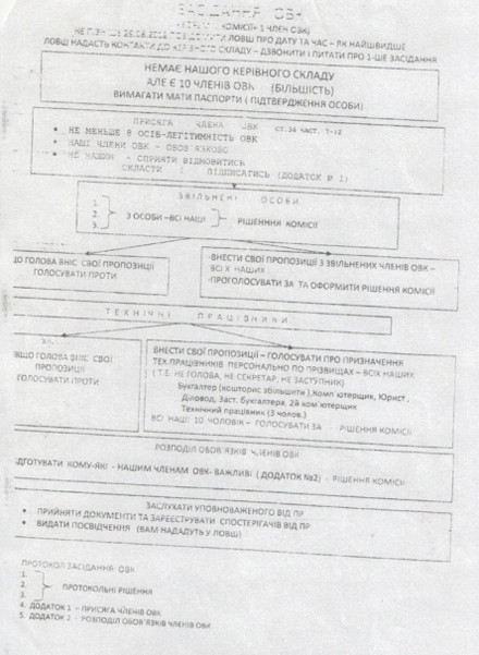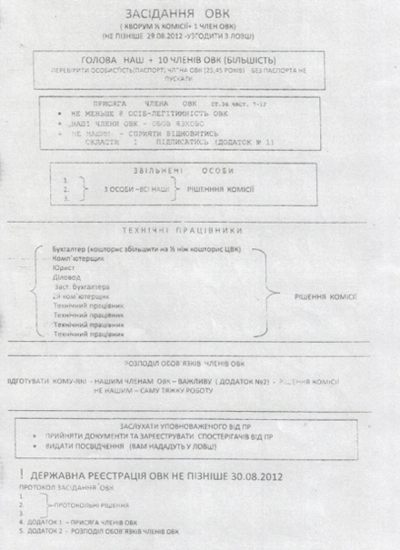 «Штаб рекомендует во время проведения заседаний ОИК «не нашим» членам ОИК способствовать отказаться от принятия присяги. Есть серьезные предложения о назначении технических работников - персонально по фамилиям. Штаб ПР рекомендует давать предложения всех «наших». Если председатель ОИК не является представителем правящей партии, то люди, которые предлагаются на технических работников должны быть «зарезаны» в процессе голосования. Также штаб предлагает увеличить смету на содержание технических работников на половину , чем это предлагается сметой ЦИК.