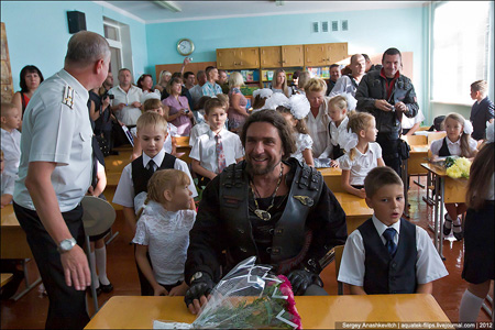 1 сентября в Севастопольской школе №8 Минобороны РФ им. 850-летия Москвы школьников посетил лидер байкерского клуба «Ночные волки» Хирург.