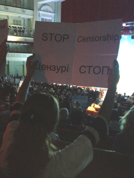 Как известно, во время выступления президента Виктора Януковича на Всемирном газетном форуме, представители «Стоп Цензуре!» подняли плакаты о цензуре в Украине и отсутствии демократии.