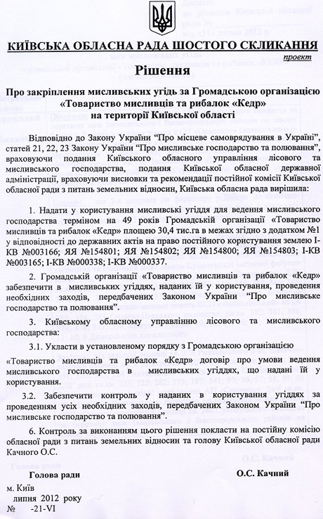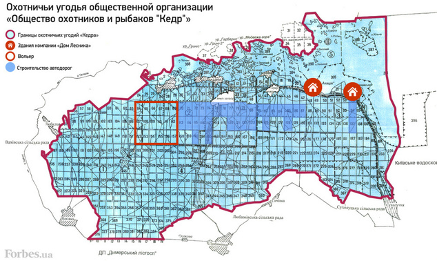 30 тысяч га Днепровско-Тетеревского лесхоза, который находится рядом с «Межигорьем», отдали в аренду на 49 лет «Обществу охотников и рыболовов «Кедр», которое связывают с Виктором Януковичем.