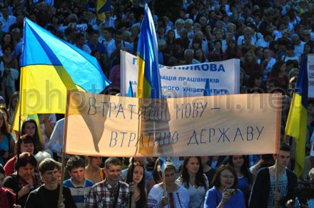 На акцию собралось около 3 тысяч педагогов и студентов. Они держали государственные флаги, а также плакаты с надписями: «Втратимо мову – втратимо державу!», «Кожне слово, сказане не по-українськи – це цвях у могилу української мови», «Нації вмирають не від інфаркту – спочатку їм відбирає мову».