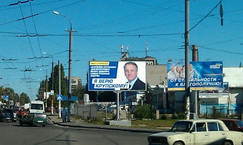На билборде с изображением мэра Ивана Куличенко размещены слова поддержки его заму Анатолию Крупскому. Напомним, что Крупский выдвинут кандидатом в народные депутаты по 24 избирательному округу от Партии регионов.