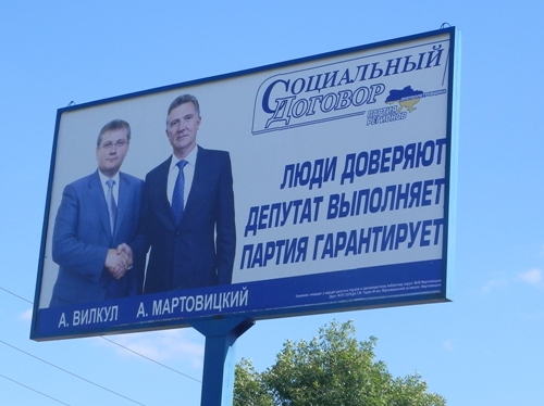 Фото с рукопожатия губернатора области с каждым из 17 мажоритарных кандидатов от ПР размещено на всех Социальных договорах, предлагаемых жителям Днепропетровщины. Напомним, что глава Днепропетровской облгосадминистрации Александр Вилкул также возглавляет областную организацию партии регионов, а мэр Днепропетровска Иван Куличенко вступил в ряды «бело-голубых» в 2010 году, накануне местных выборов.