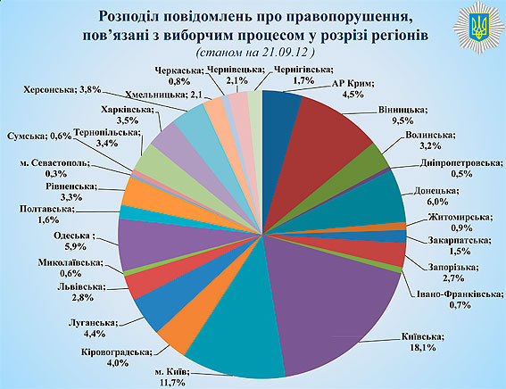 Значительное число нарушений также зафиксировано также в Винницкой (9,5%), Одесской (5,9%) и Донецкой (6%) областях. Наименьшее число нарушений зафиксировано в Севастополе (0,3%), а также в Днепропетровской (0,5%) и Ивано-Франковской (0,7%) областях.