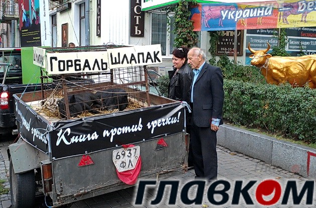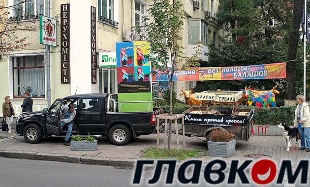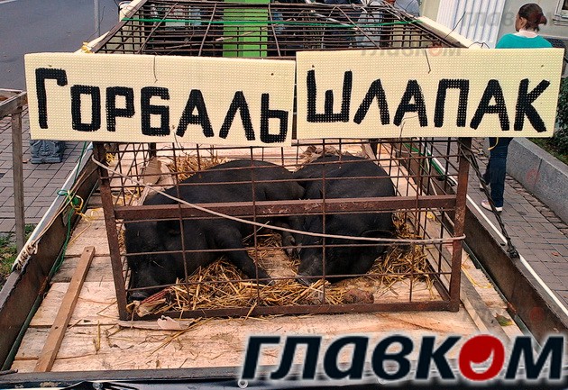Балашов загрузил в прицеп автомобиля двух поросят, к клеткам с которыми прикрепил таблички с фамилиями Горбаль и Шлапак. Напомним, что Василий Горбаль и Алла Шлапак также являются кандидатами в депутаты от этого округа.