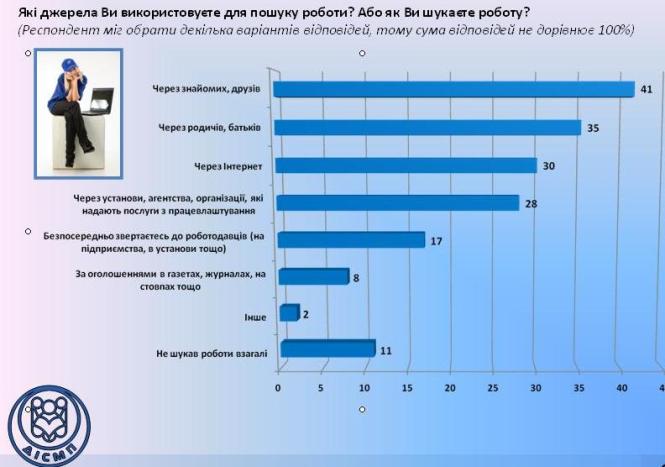 По данным исследования института, 41% студентов находят работу с помощью знакомых и друзей, 35% - на работу устраивают родители, 30% - успешно трудоустраиваются с помощью Интернета.