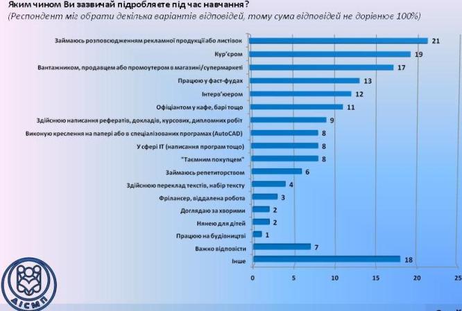 По его словам, раздачей рекламной продукции занимаются 21% студентов, курьерами работают – 19%, работой в супермаркетах заняты 17% опрошенных.