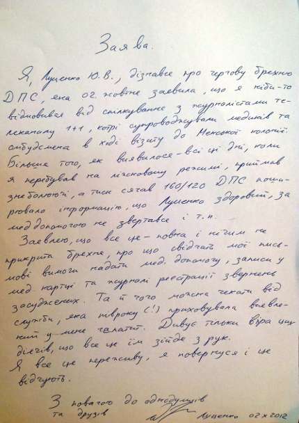 «Я, Луценко Ю.В., узнал очередную ложь ГПС, которая 2 октября заявила, что я якобы отказался от общения с журналистами телеканала 1+1, сопровождавшими медиков и омбудсмена в ходе визита в Менскую колонию. Более того, как оказалось - все эти дни, когда я находился на постельном режиме, принимал обезболивающие, а давление достигало 160/120, ГПС распространяла информацию, что Луценко здоров, за медпомощью не обращался. Заявляю, что все это - полная и ничем не прикрытая ложь, о чем свидетельствуют мои письменные требования оказать медицинскую помощь, записи в медицинской карте и журнале регистрации обращений осужденных», - говорится в заявлении экс-министра.