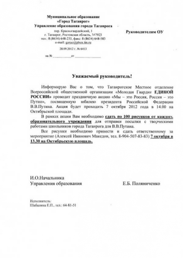 Управление образования города Таганрога Ростовской области разослало в школы города распоряжения сдать к юбилею Путина по 100 рисунков с изображением президента от каждого образовательного учреждения. Документ опубликовал в своем Twitter известный блогер Рустем Адагамов.